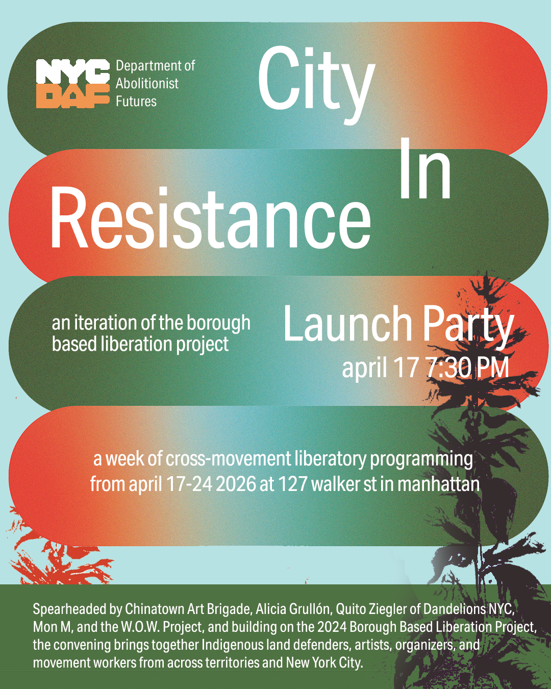 City in Resistance, an iteration of the Borough Based Liberation Project of 2024, will launch on April 17, 2026 at 127 Walker Street in Chinatown, New York, opening a week-long space for gathering, exchange, and organizing during Earth Week and an alternate home for indigenous organizing parallel to the UN Permanent Forum on Indigenous Issues.